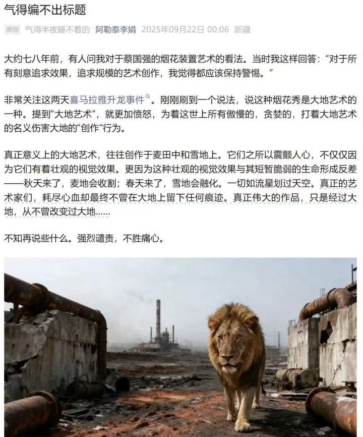 那么多有关部门却一路绿灯大力支持,始祖鸟和蔡国强公然轰炸我们的龙脉,也难怪著名鲁奖作家李娟,半夜炮轰蔡国强,气到编不出标题。