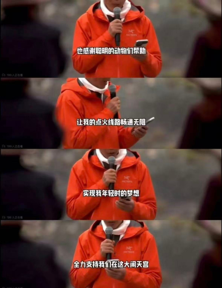 他居然好意思感谢牧民配合,感谢聪明动物的帮助,感谢大家和他一起实现了自己年轻时的梦想,还特别强调了,感谢公安、消防、卫健各部门,支持自己这次大闹天宫。