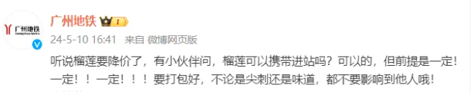 去年榴莲成熟季时,广州地铁曾回应是否可以携带榴莲进站:可以的,但前提是一定要打包好,不论是尖刺还是味道,都不要影响到他人。
