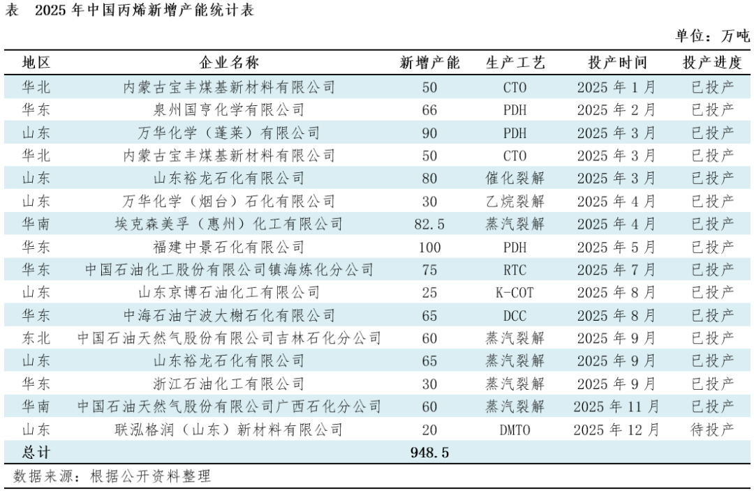 2025年中国丙烯新增产能在主要交易地区集中释放,蒸汽裂解工艺产能占比最大。从区域分布来看,2025年华东丙烯新增产能336万吨,山东丙烯新增产能预计在310万吨,两大主要交易地区新增产能在丙烯新增总产能中占比达到68%。此外,华南、华北、东北地区亦有丙烯新增产能释放,但整体占比较少。2025年主要交易地区新增产能的释放导致市场供应压力加剧,生产企业出货长期承压,对丙烯价格产生的下行压力进一步增大。从生产工艺来看,新增产能以蒸汽裂解工艺为主,部分PDH、催化裂解、乙烷裂解工艺同步释放,丙烯行业原料多元化趋势更加明显,企业更加注重原料成本控制。同时,部分新技术的应用也标志着行业竞争的核心从规模扩张逐渐转向创新驱动。从生产企业来看,丙烯新增产能主要来自于现有企业的扩产与改造,企业通过规模化、园区化降本增效,同时依托技术升级优化生产工艺。这一趋势在政策引导“退城入园”和淘汰落后产能的背景下,正持续推高行业壁垒与市场集中度,最终或形成强者恒强的市场格局。