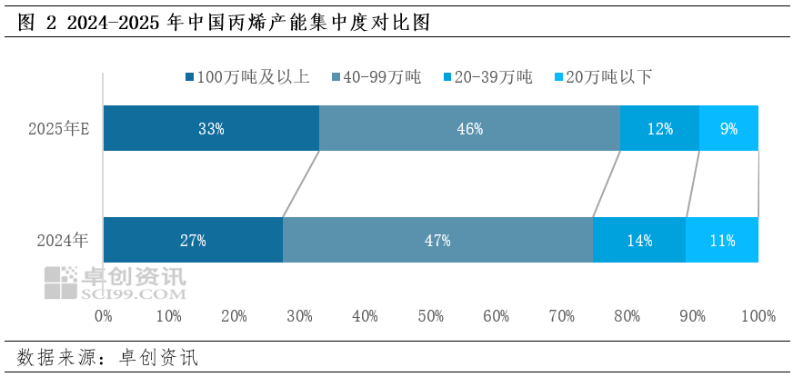 丙烯行业一体化、规模化、多元化发展趋势是导致丙烯产能集中度提升的主要原因。近年来,伴随炼化一体化装置、PDH装置持续扩能,多家头部企业陆续投产二期、三期装置,单企业产能规模显著提升,规模效应不断增强。随着头部企业产能占比提高,其对市场价格的影响力逐步增强,中小规模企业由于成本竞争力及配套能力较弱,市场话语权不断下降,部分中小企业面临产能退出或转型压力。预计未来随着丙烯产能集中度的进一步提升,丙烯价格波动将更易受主要企业产能调整的影响。