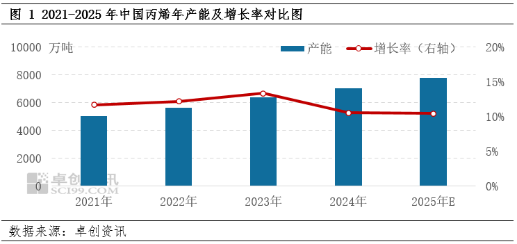 丙烯产能扩张受项目投资惯性、政策及战略布局等多重因素共同推动。2021年丙烯产业链利润达到峰值,促使企业积极规划新增产能,项目投资惯性导致近五年丙烯产能进入加速增长阶段。同时,在“碳达峰”、“碳中和”等政策因素及炼化一体化战略布局影响下,产能大、污染小的丙烷脱氢(PDH)工艺产能快速扩张,进一步推动行业产能增长。2025年中国丙烯产能增长率依旧偏高,新增产能释放导致行业过剩压力进一步加剧。
