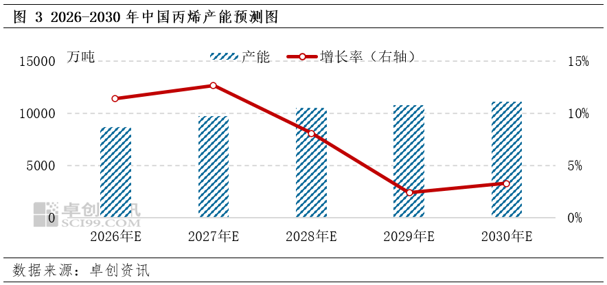 2026-2030年股票知识网,中国丙烯产能延续扩张态势,拟建产能预计超过3300万吨,不过拟建产能多集中在2026年至2028年释放,2028年以后丙烯产能增速显著趋缓。未来五年中国丙烯产能复合增长率预计在7.48%,较近五年下降4.14个百分点。2026-2028年丙烯产能增长主要受项目投资惯性驱动,前期高利润阶段规划的大量项目步入集中投产周期,从而推高了产能增速。此后随着市场过剩压力增大,新增产能增速下滑,2029-2030年丙烯产能增长率预计明显降低。