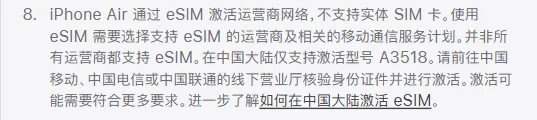 苹果表示,用户去运营商的线下营业厅之前,需要设置好iPhoneAir。另外,包括国行iPhoneAir(A3518)在内,国内eSIM机型最多可绑定2个eSIM号码,作为比较,海外机型可开通8张以上eSIM卡。