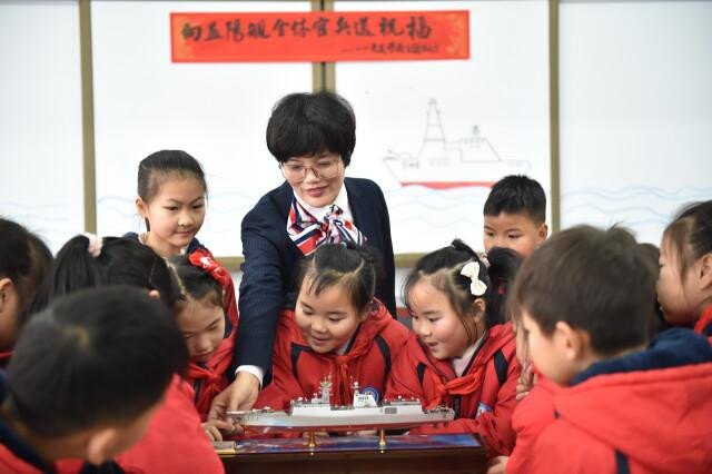(东华完小老师带领小朋友观看益阳舰模型。受访者供图)